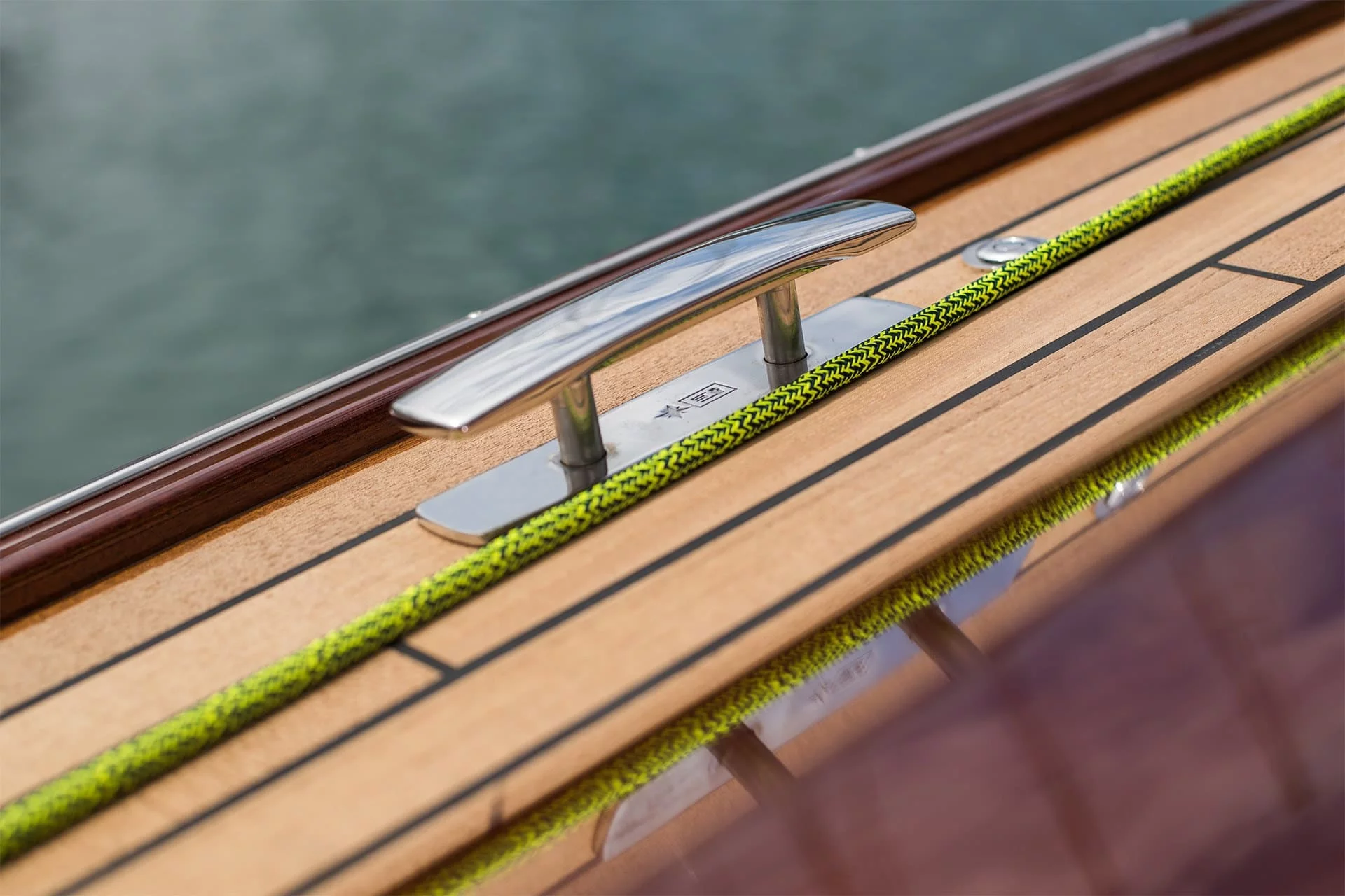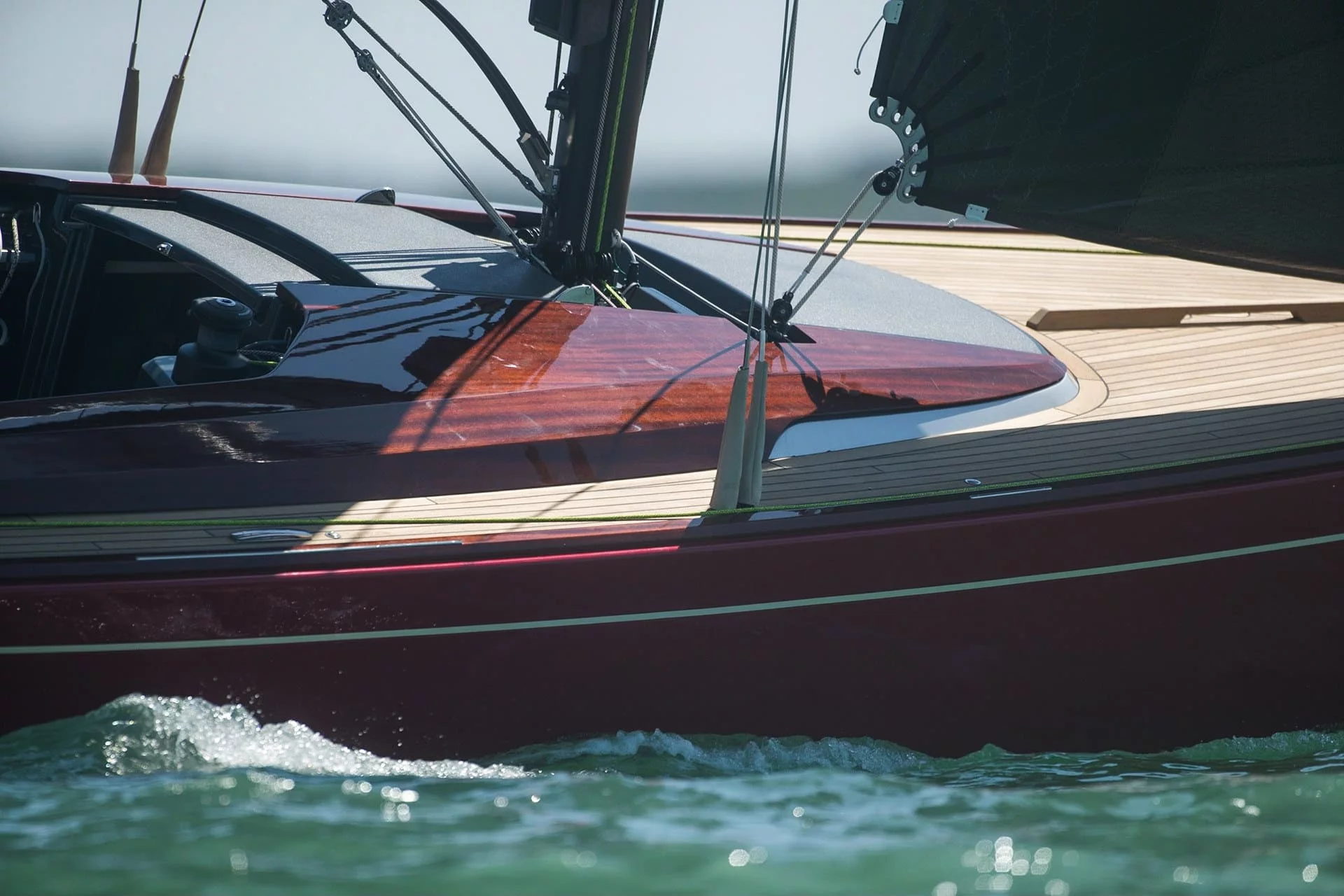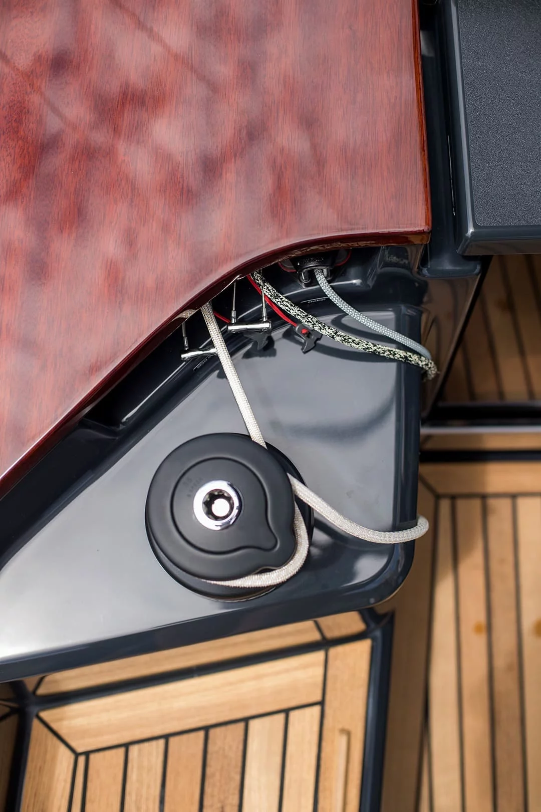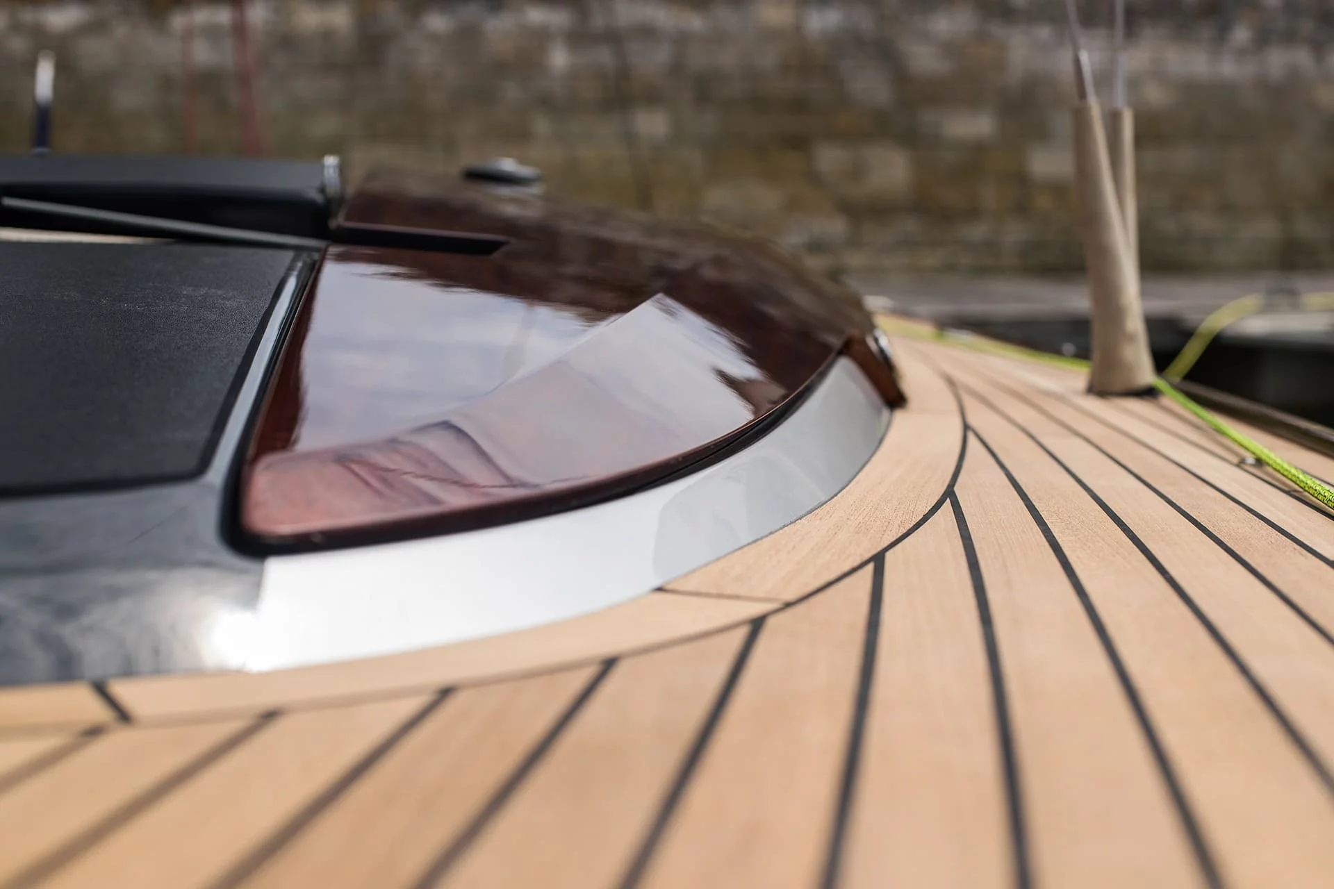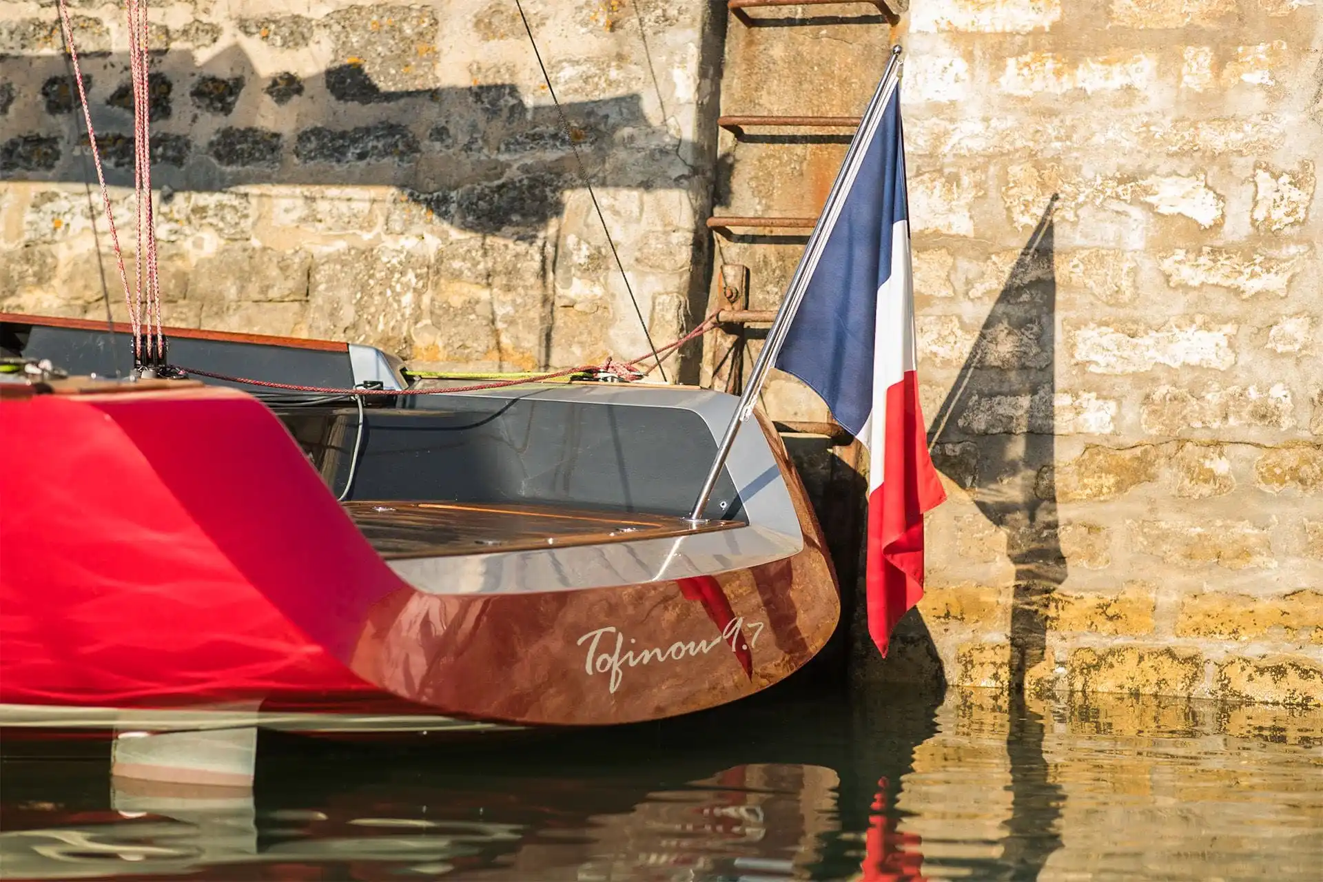 The fundamentals of the Tofinou are preserved, including the recognizable varnished mahogany coamings, a signature of the shipyard. This model exemplifies the shipyard’s expertise in working with stainless steel, chrome, and a carbon fiber bowsprit.