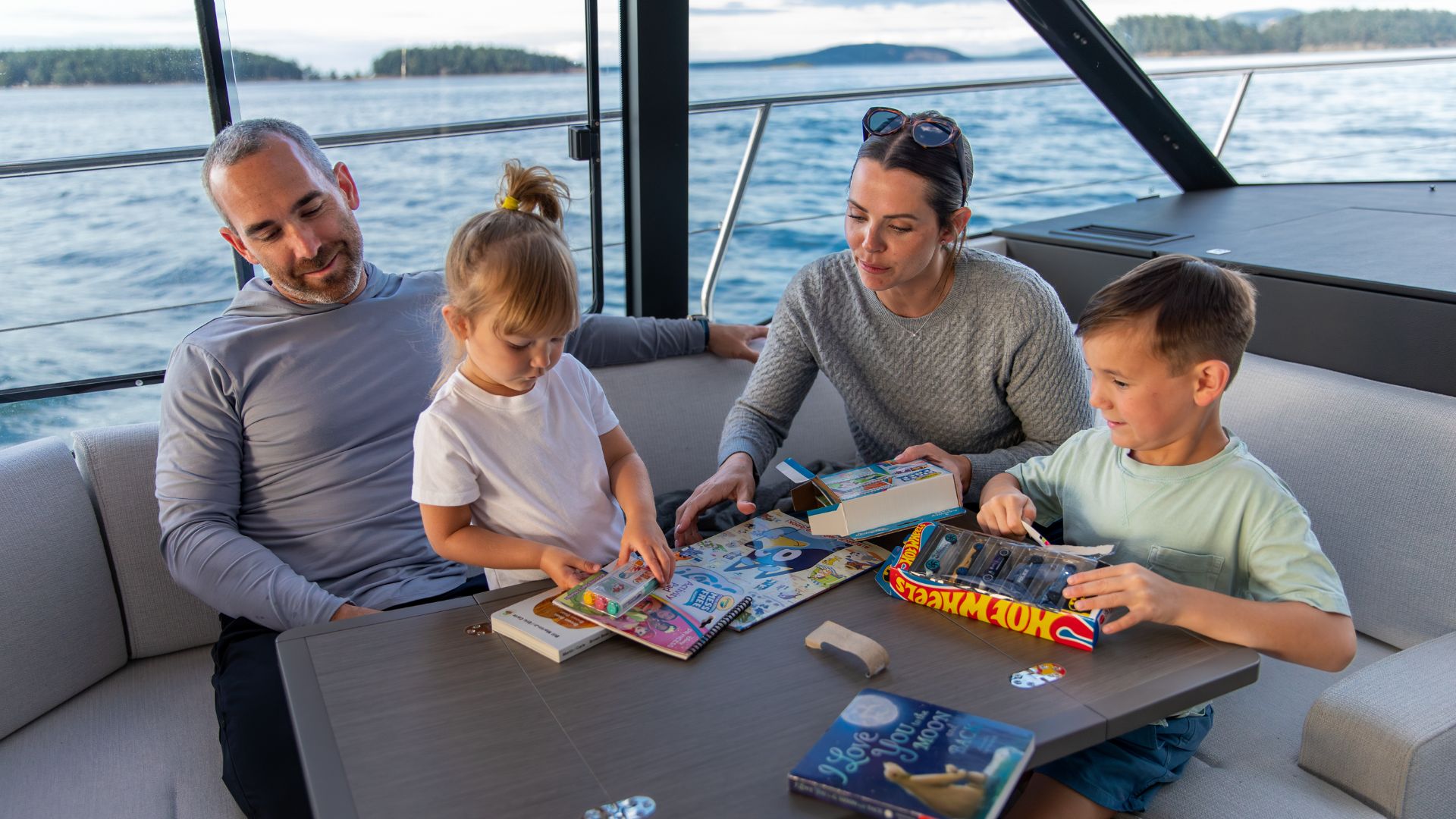 Our flagship model was designed as an apartment on the water and offers a spacious, luminous living area from the wheelhouse to the cockpit, featuring 360° views of the sea and two sunroofs that open. The U-shaped galley seamlessly connects indoor and outdoor spaces, perfect for gatherings and easy movement. Inside, a cozy salon awaits with plush seating, rounded edges, armrests, and leather handrails, centered around an extendable table with two leaves for ample seating.