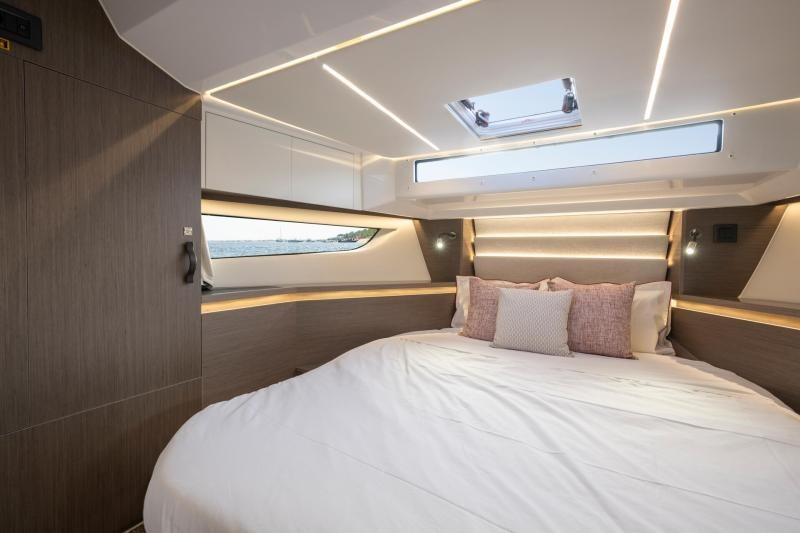 With her three cabins and two head compartments, she features all the elements that make the NC 1295 a success: a panoramic view over the water, large, bright windows in the hull, a forward owner’s cabin with separate shower, and two guest cabins, either with twin berths or with one large berth. The U-shaped galley, well-equipped and with ample storage, opens onto the cockpit and exterior living areas, creating an inviting gathering spot. A swiveling pilot seat allows for easy interaction with guests in the saloon, while a cozy sofa, just like at home, encourages shared moments with family and friends. Attention to detail has been a top priority. The interior fit and finish have been carefully crafted to offer a remarkable quality of life on board, with plush sofa seating for refinement and comfort. This boat checks all the boxes for enjoying a fun family cruise, with exceptional distinct living areas that ensure everyone’s privacy during multi-day outings!