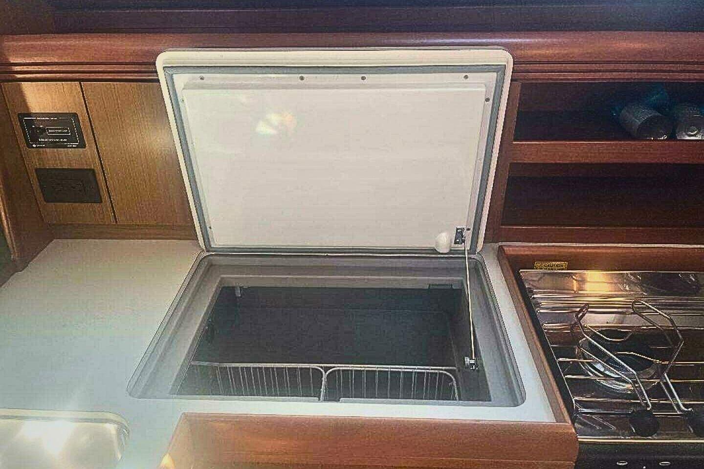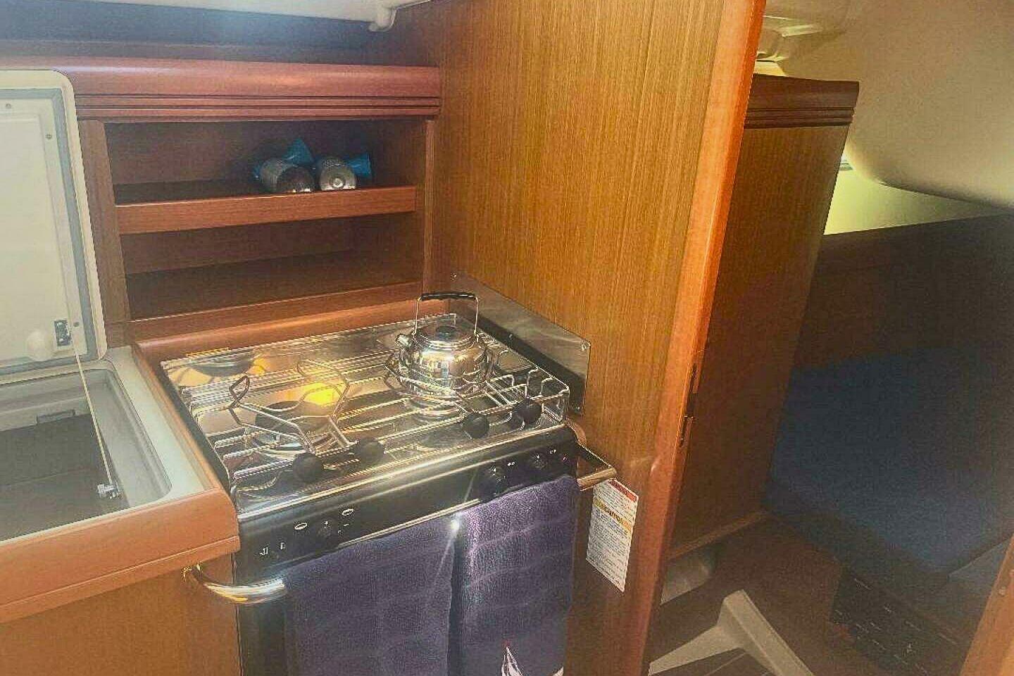 Gas locker located in lazarette locker under starboard helm seat, room for 2–10-gal gas bottle with connection to gas system and cut-off valve under stove in the galley